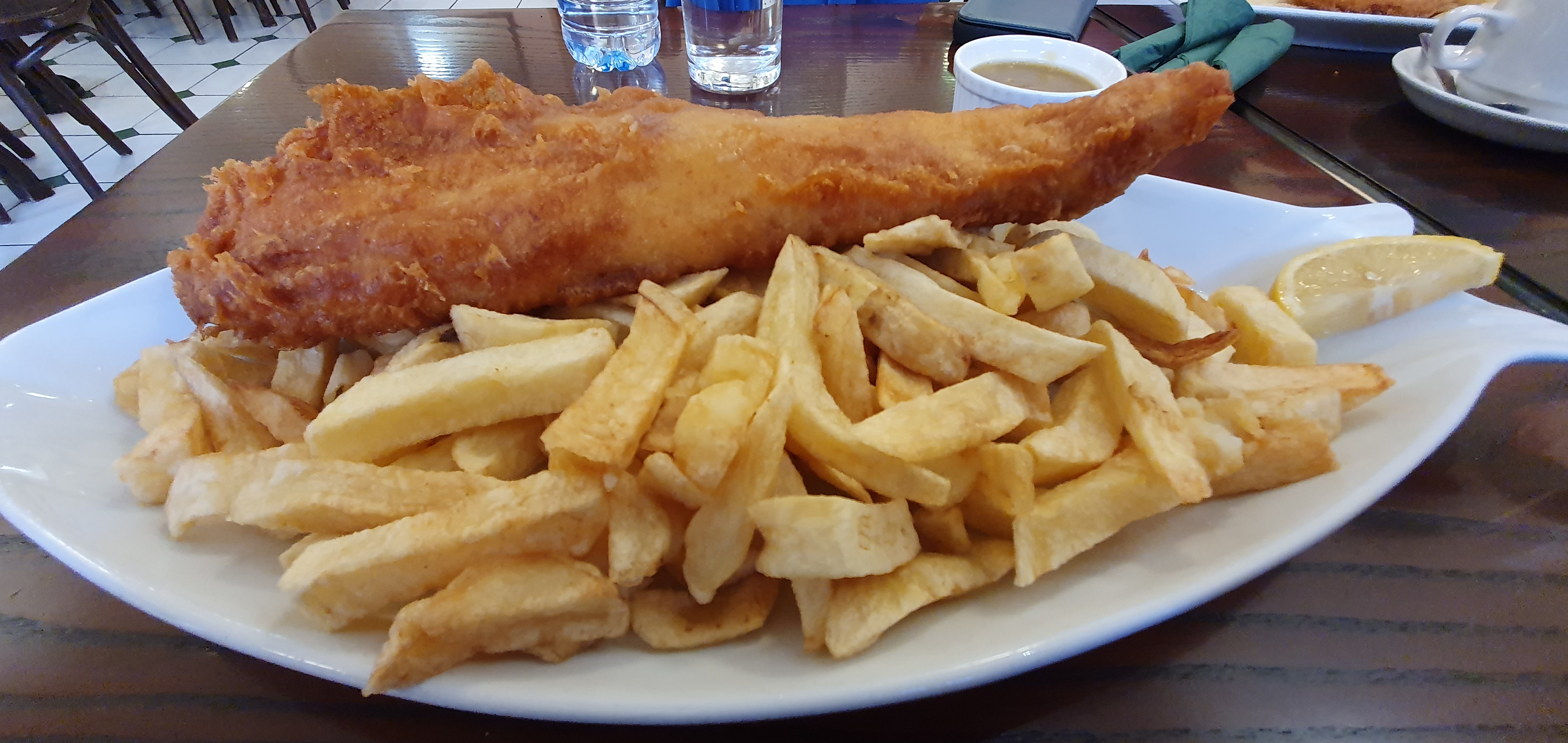 The food continues to impress. Their fish and chips are far from your average seaside fry-up—these are crisp, golden masterpieces. The large cod is a proper showstopper: generously portioned, cooked to flaky perfection, with a batter that crackles and sings with each bite. Presentation-wise, everything was served simply but neatly on plates—nothing overly fancy, but that’s exactly the charm. This is a proper fish & chip shop where flavour and portion size take centre stage.