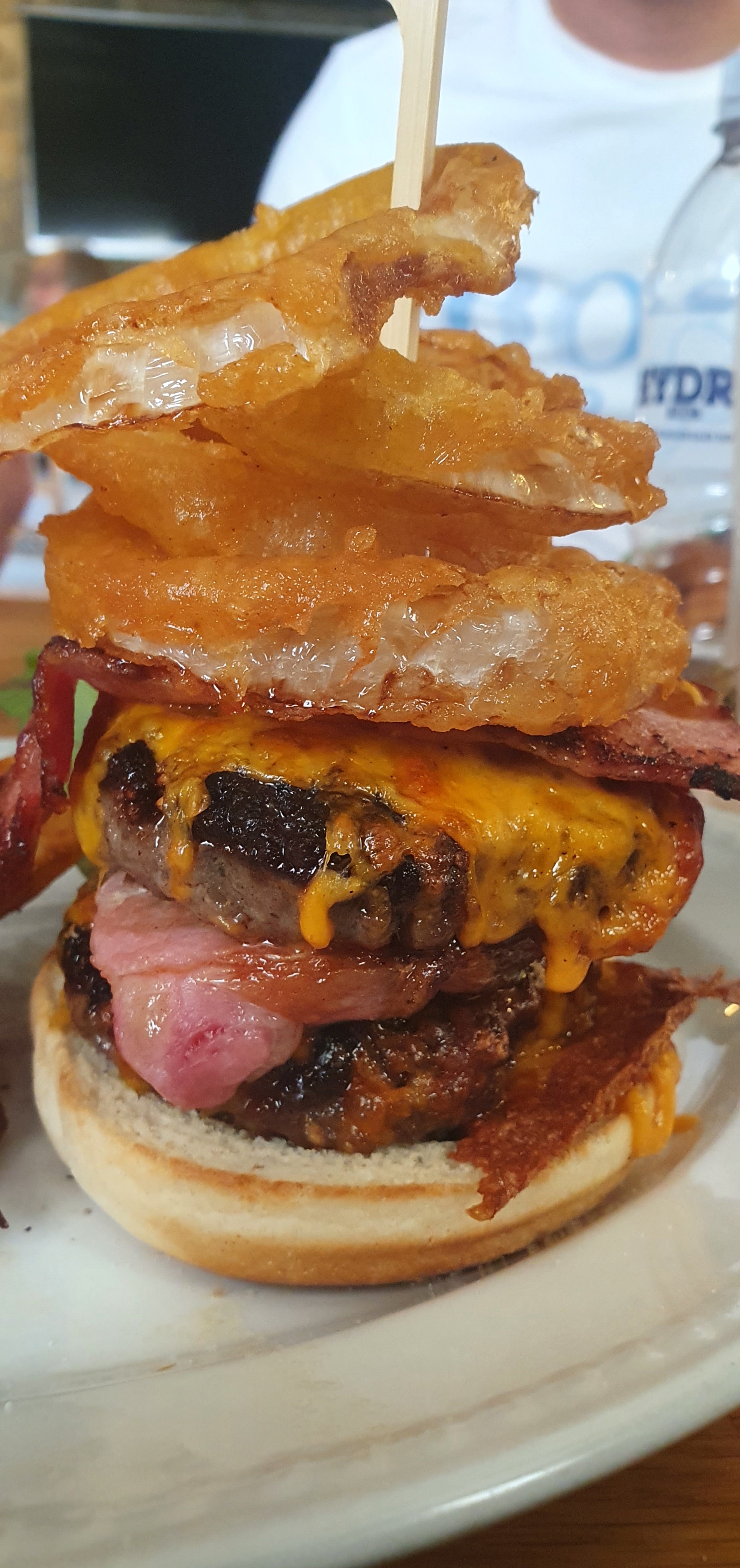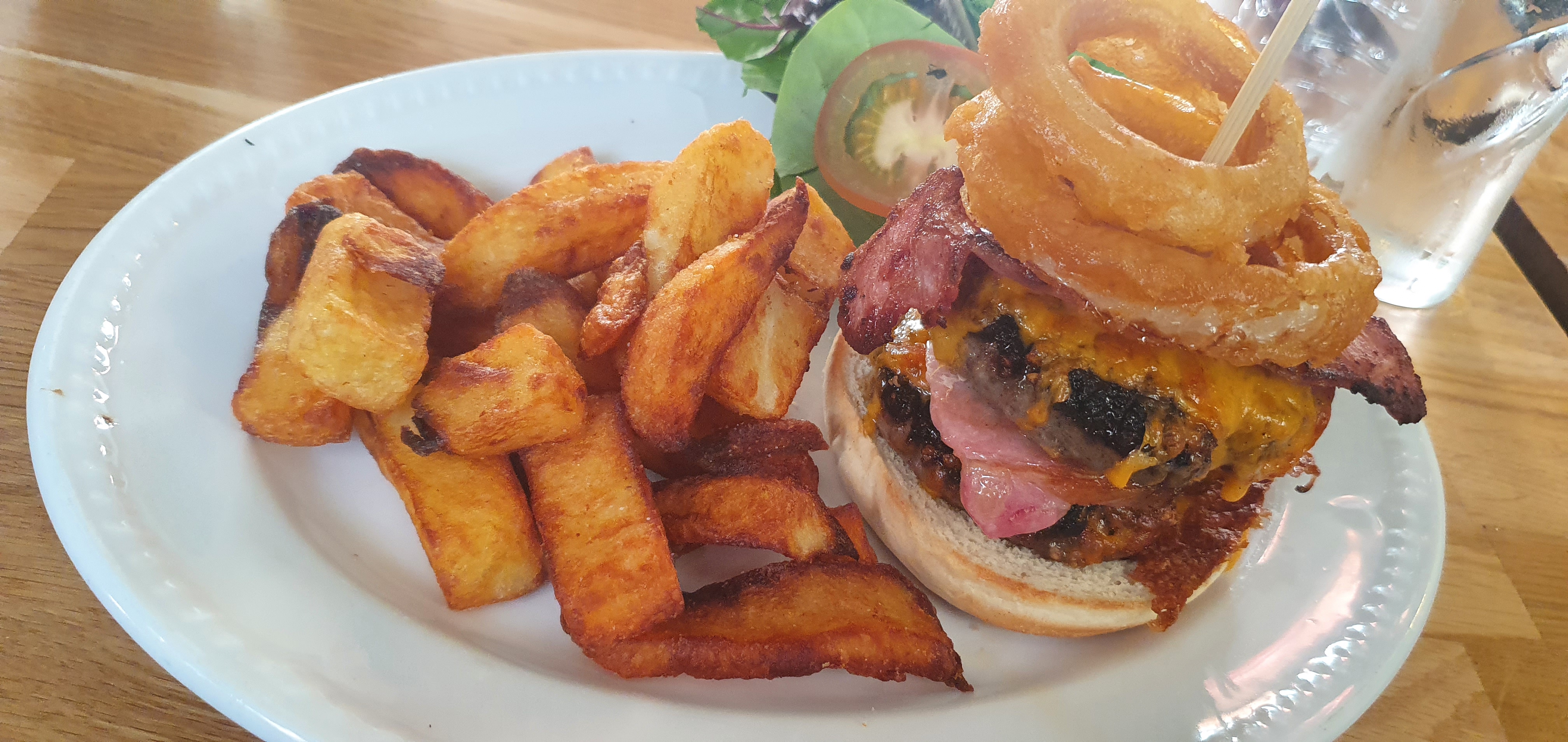 The Witching Post Inn also operates as a B&B, making it a convenient spot for both dining and lodging. The menu strikes a perfect balance, offering a variety of choices without being overwhelming. Options include Chicken Parmesan, Whitby Scampi, and Bangers & Mash. However, we all opted for the Witching Post Burger—a double cheese and bacon burger topped with onion rings, served with a side of triple-cooked chips. The chips were particularly memorable, crispy on the outside and fluffy on the inside, thanks to being cooked in a special type of fat.