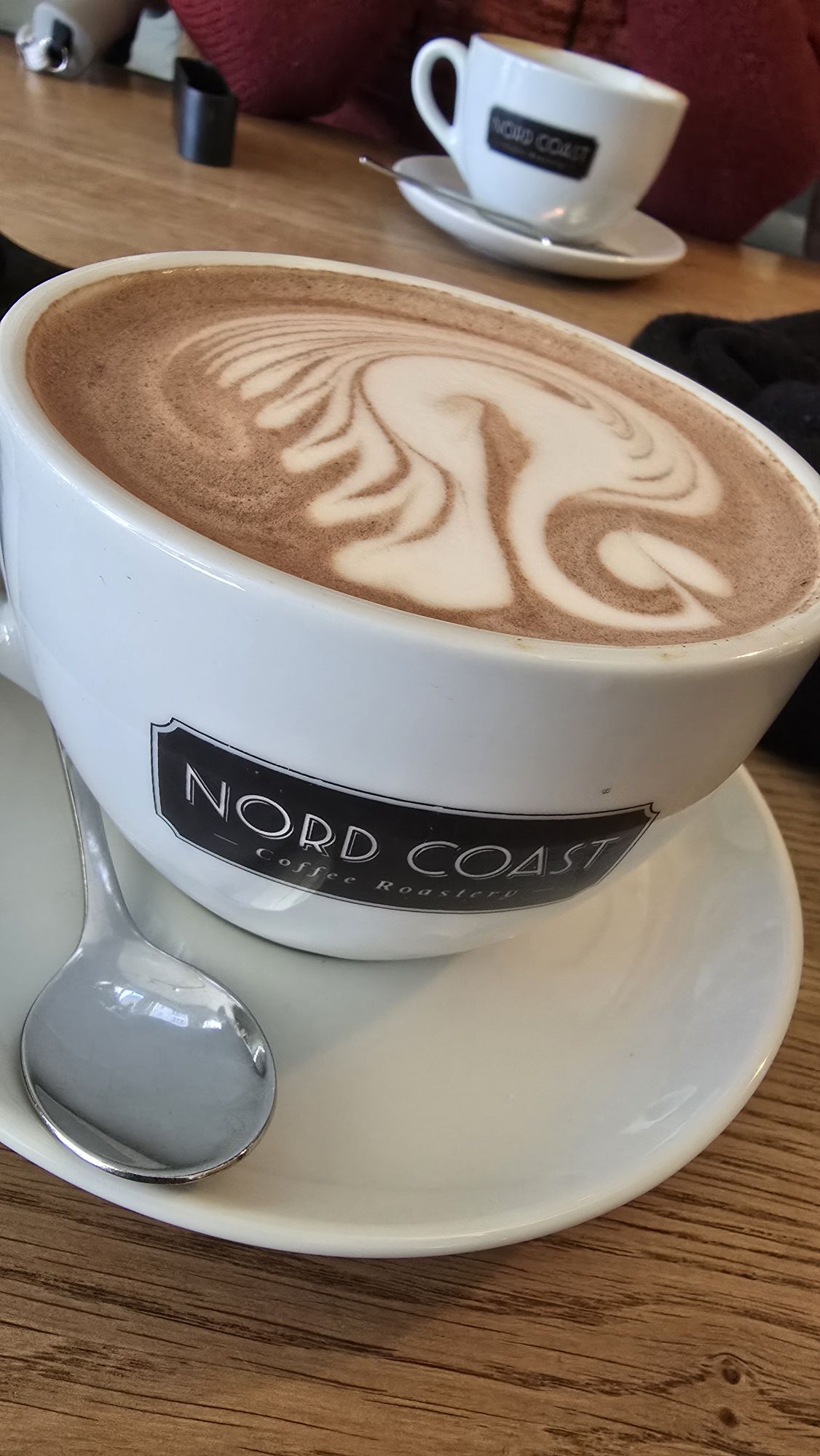Our first coffee stop was on the renowned street of Deichstraße, at the cozy Nord Coast Coffee Roastery. This charming two-story coffee shop freshly grinds its coffee and offers a diverse menu featuring all the usual coffee favorites, from Americanos to Lattes, as well as an array of freshly prepared food options. During our visit, we sought refuge from the brisk -5°C weather with a steaming hot drink. We were a group of six exploring Hamburg, and one of our companions proclaimed it to be one of the best coffees they had ever tasted!