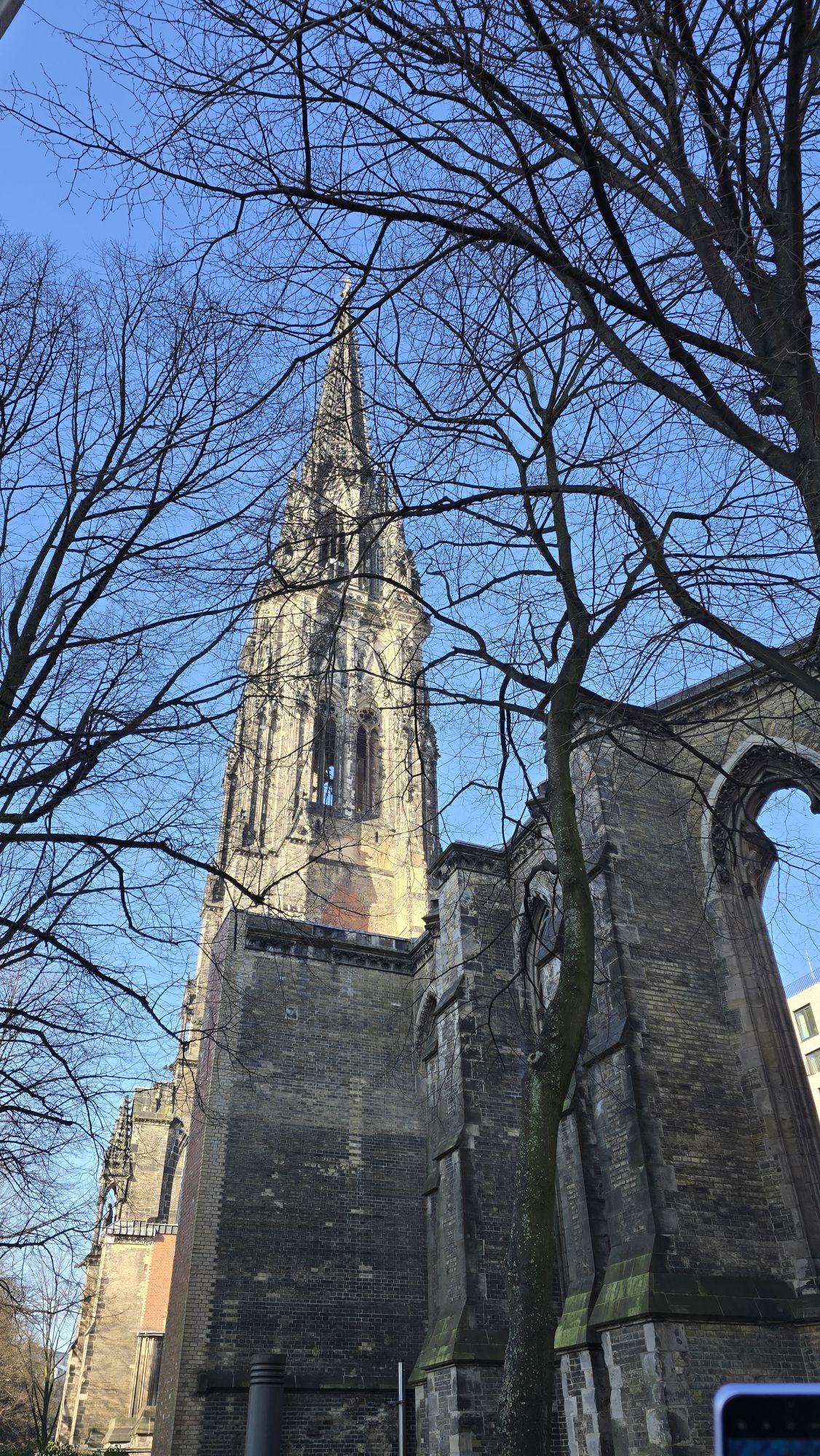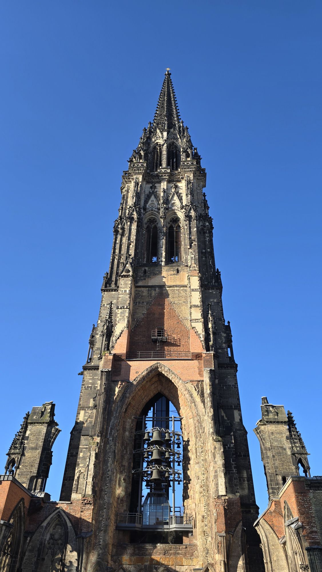 Our third stop on our Hamburg adventure was the St. Nikolai Memorial. This historic church has experienced multiple rebuilds throughout its lifetime and was notably the tallest building in the world from 1874 to 1876. Unfortunately, during World War II, the church suffered extensive damage from bombings, leaving only the crypt and the tower intact. In 2005, an elevator was installed in the tower, allowing visitors to ascend to the top and enjoy panoramic views of the city. While we appreciated the vantage point during our visit, the views were somewhat obscured by the metal fences surrounding the tower’s summit.