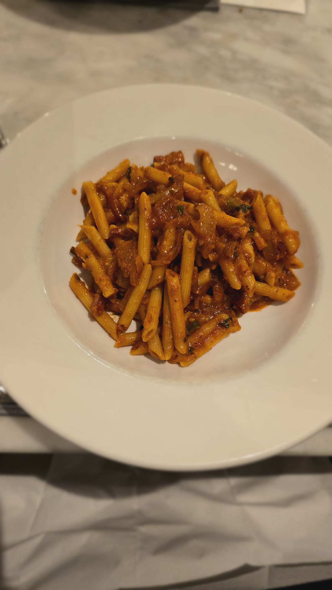 On our return visit, we started with pillowy garlic bread, my husband couldn’t resist ordering the Carbonara again, and I opted for Penne Capricciose. The consistency was impressive — every bite just as delicious as the first time.