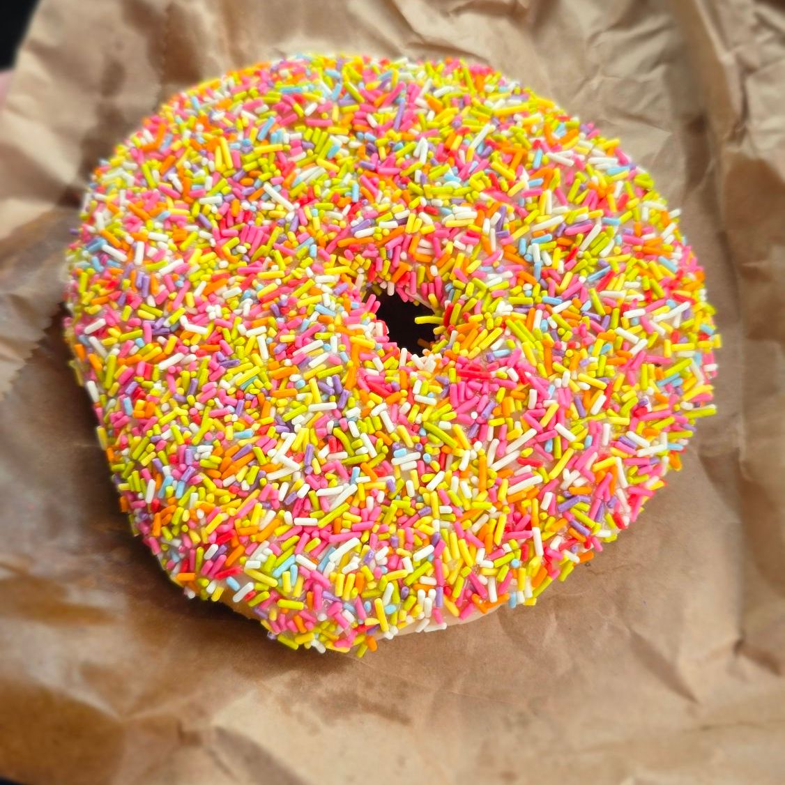 They had a plethora of baked goods for sale, from doughnuts, pies, pasties & all sorts of cake. The one nostalgic baked good I was looking for was an iced ring doughnut covered in multicolour sprinkles, and of course, as I walked past the shop window, there they were, calling my name. I had to get 2, one for there and then, and one for later on in the day, because I know I would be wanting another!