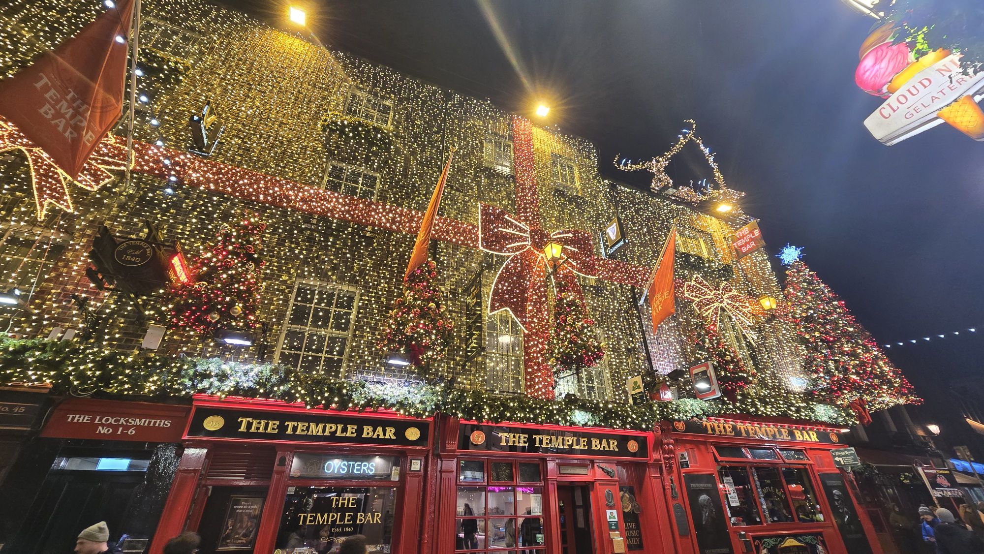 Another Dublin staple that you will see on lists across the internet is a visit to the Temple Bar district. This area is where you will find a lot of the bars and pubs where you can find local musicians playing traditional Irish music as well as covers of some of the best music around. Personally, we aren’t big drinkers, so we didn’t visit any of the bars. Thee Temple Bar is the main tourist hotspot in this area, at this time of year it is also lit up in all of its Christmas decorations, a perfect selfie spot.