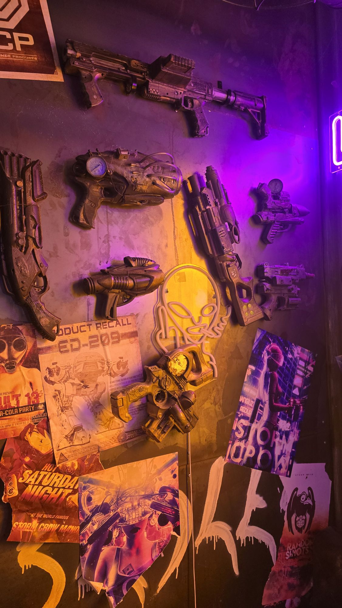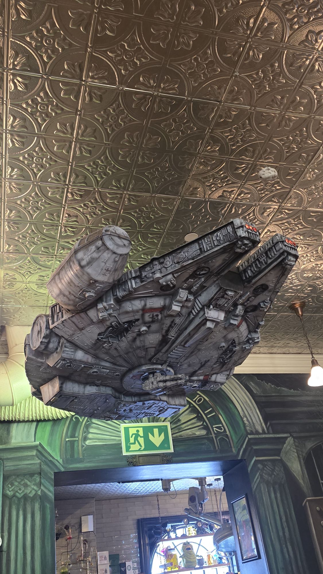 The décor alone is worth the visit. There’s a Millennium Falcon hanging from the ceiling, themed sections inspired by franchises like Borderlands, and countless little details dotted around that make you want to get up and explore.