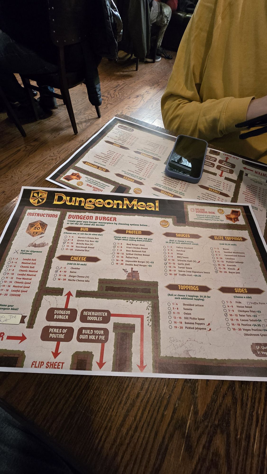 You’re given dice and can choose whether to roll for a burger or pasta. Naturally, we both went for burgers. Each roll determines different elements of your meal — bun, protein, toppings, sauces, sides — making it completely random and ridiculously fun.