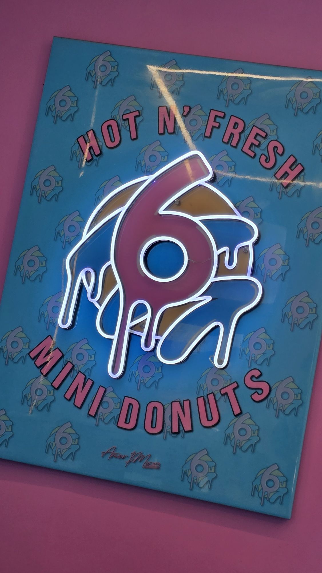 Think blue and pink walls matching the brand, a glowing neon sign as you walk in, and a welcoming layout that feels built for quick, fun dessert stops rather than long sit-down visits.