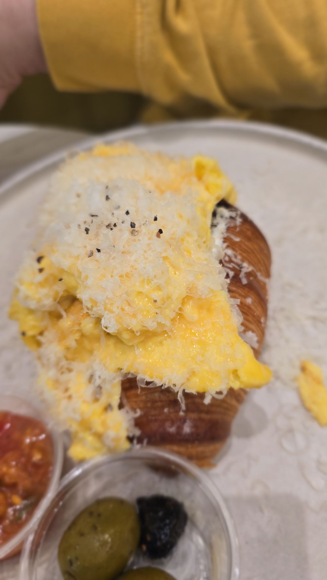 The breakfast croissant was another standout. Soft, buttery pastry filled with creamy scrambled eggs, crème fraîche, and black pepper — simple, but done exceptionally well. My husband was all in on this one.